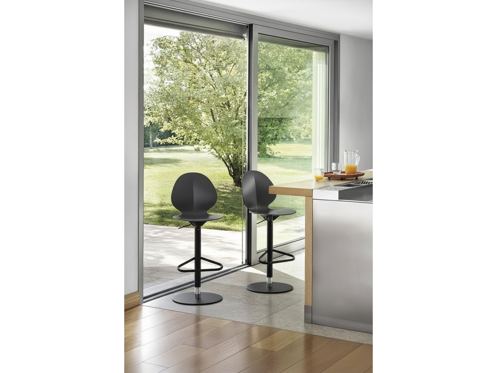 Barová židle Sweel přináší do jídelen pohodlí a praktičnost: je výškově nastavitelná a otočná, její naducané sedadlo a opěradlo komfortně usadí každého milovníka barovek.