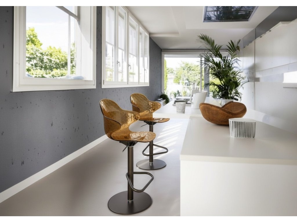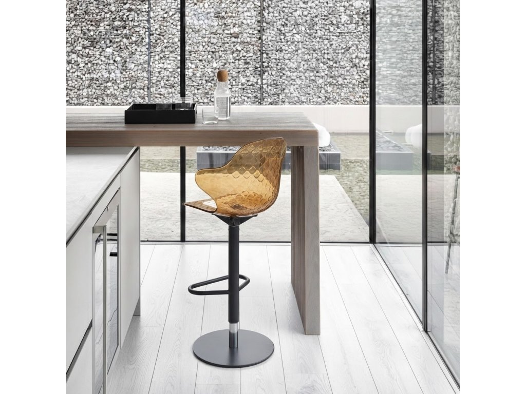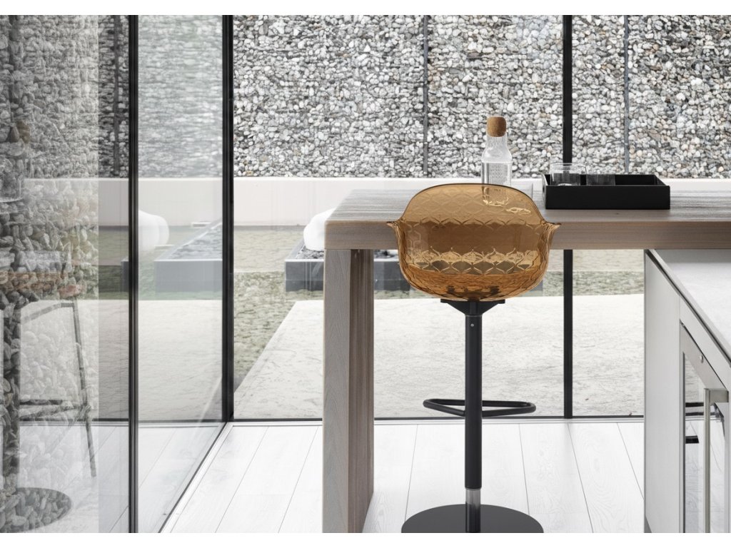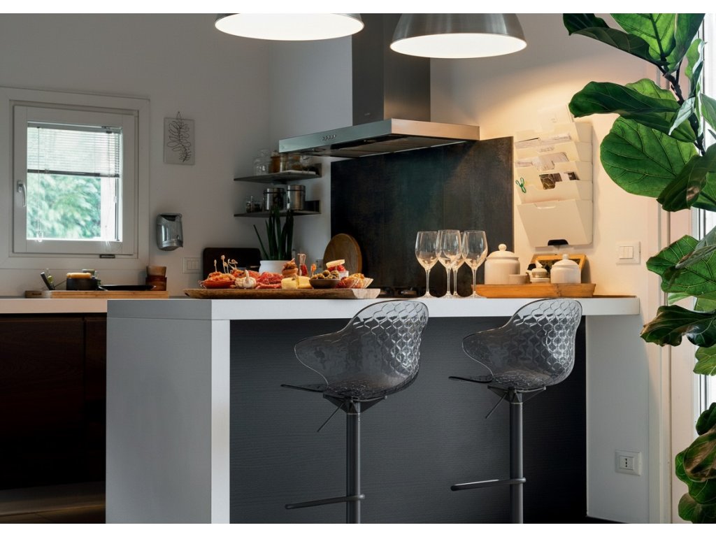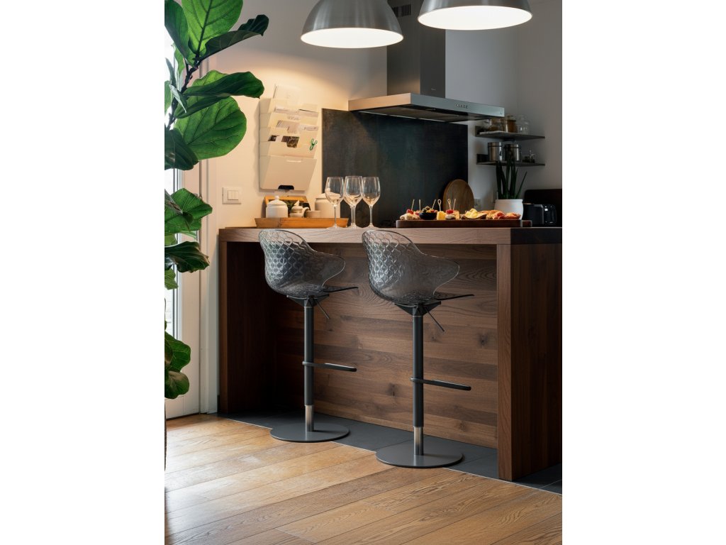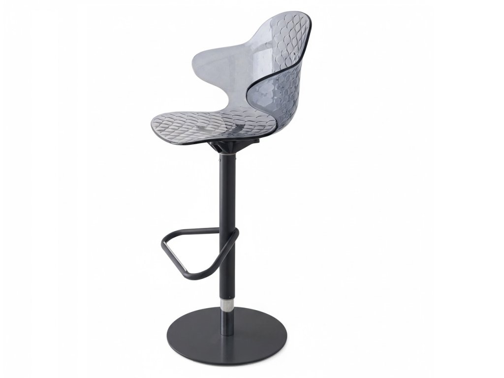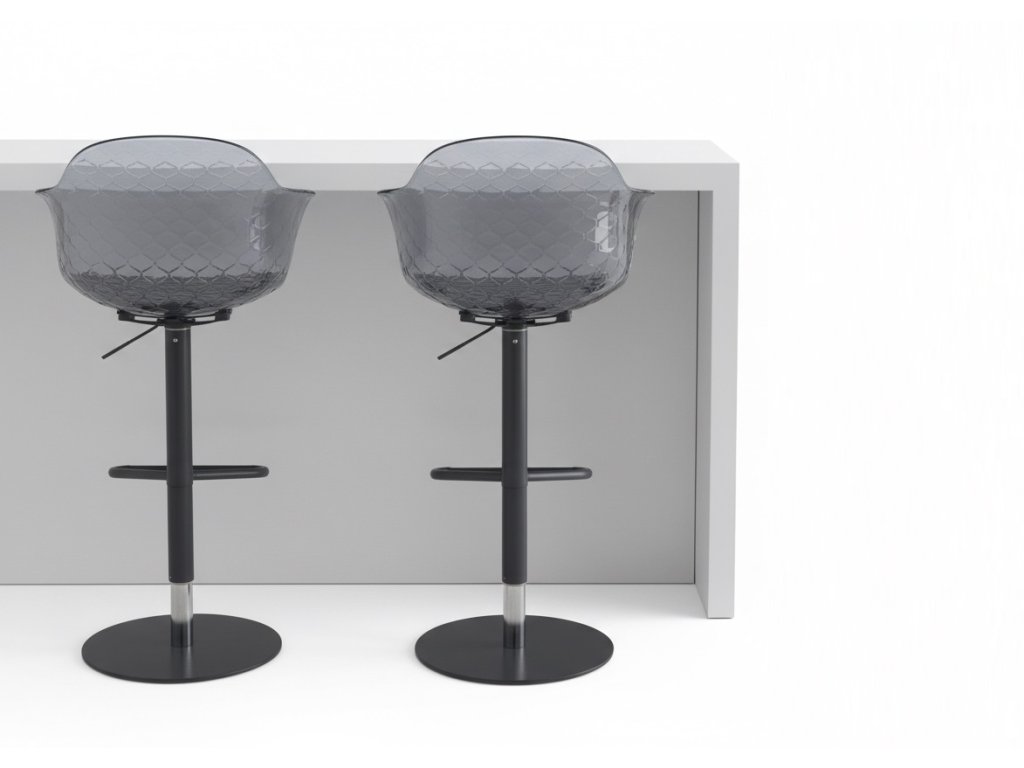 Barová židle Sweel přináší do jídelen pohodlí a praktičnost: je výškově nastavitelná a otočná, její naducané sedadlo a opěradlo komfortně usadí každého milovníka barovek.