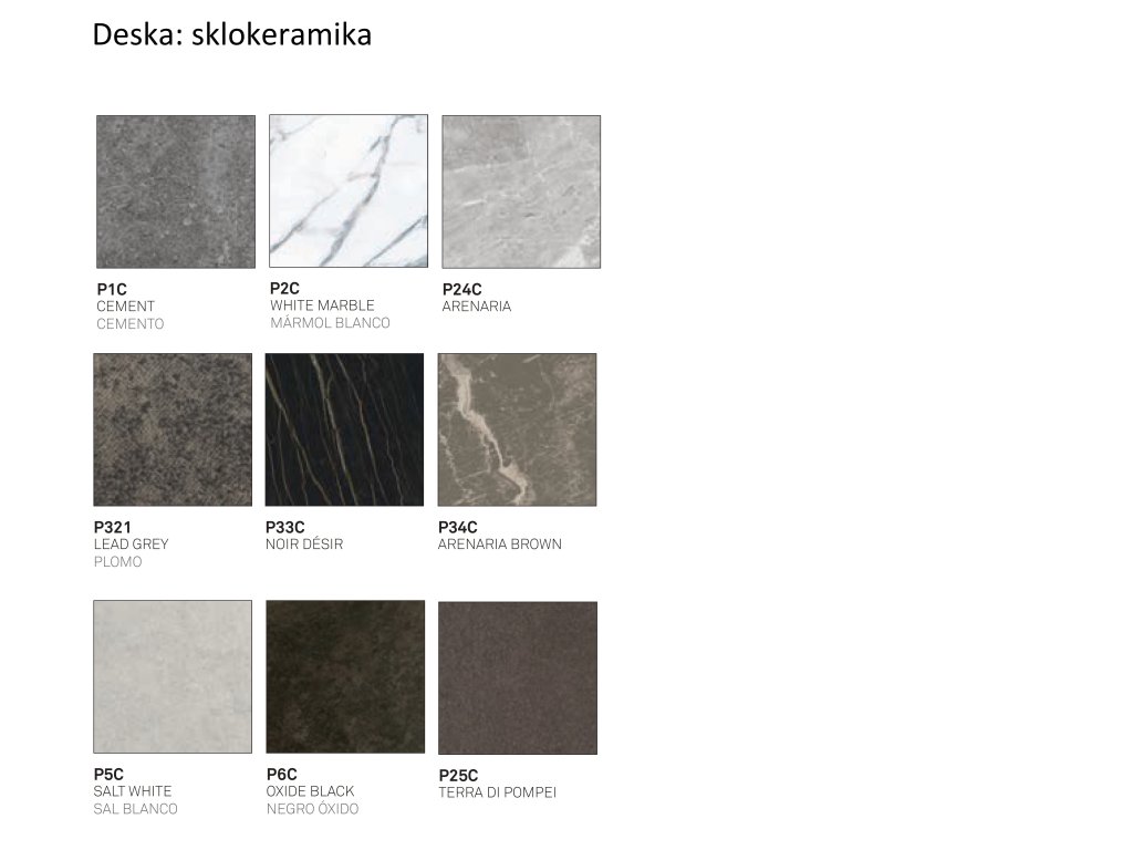 | Barva desky sklokeramické: | Stone Grey (matná kamenná šedá), Nougat (matná nugátová), Lead Grey (matná olovnatě šedá), Cement (matná cementově šedá), Salt White (barva přírodní soli matná), Black Oxide (černý oxid matná) |