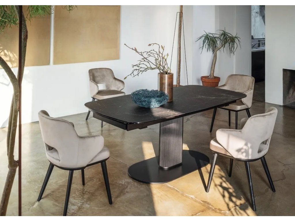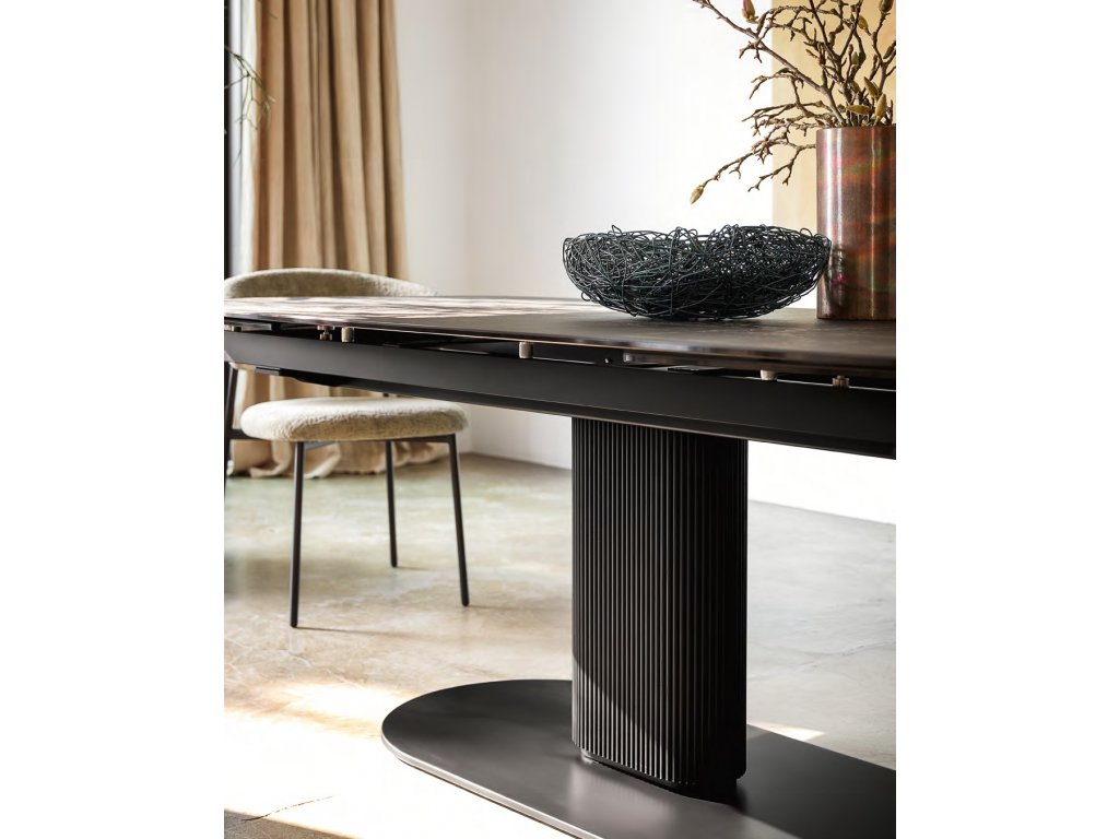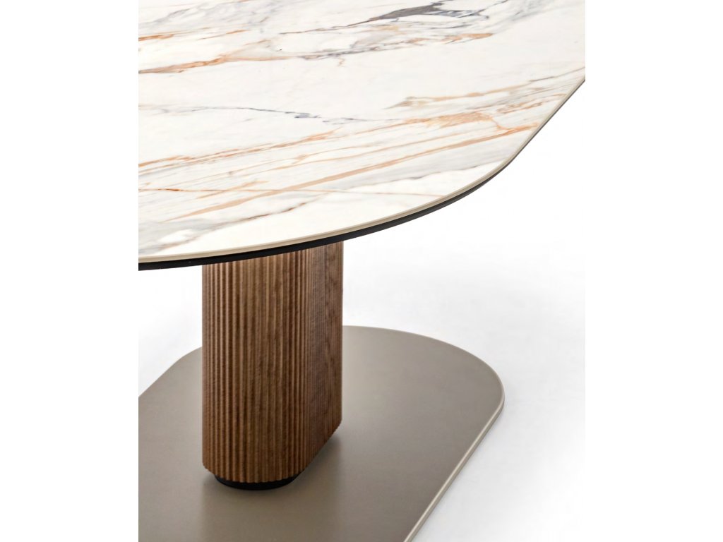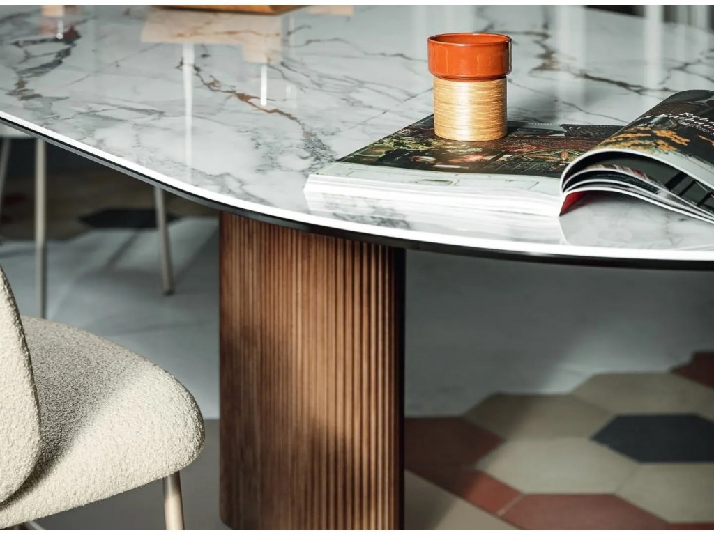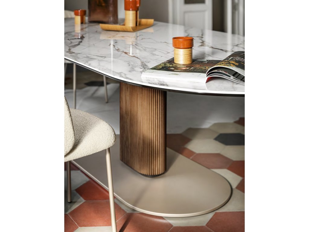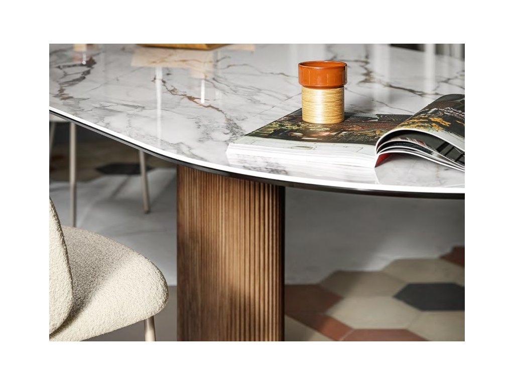 Oválný stůl Abrey s nohami z masivního jasanového dřevo se zaoblenou podnoží přináší eleganci a robustnost. Oválná deska ze sklokeramiky nabízí dekory vzácných mramorů...