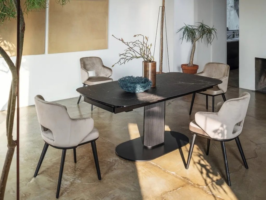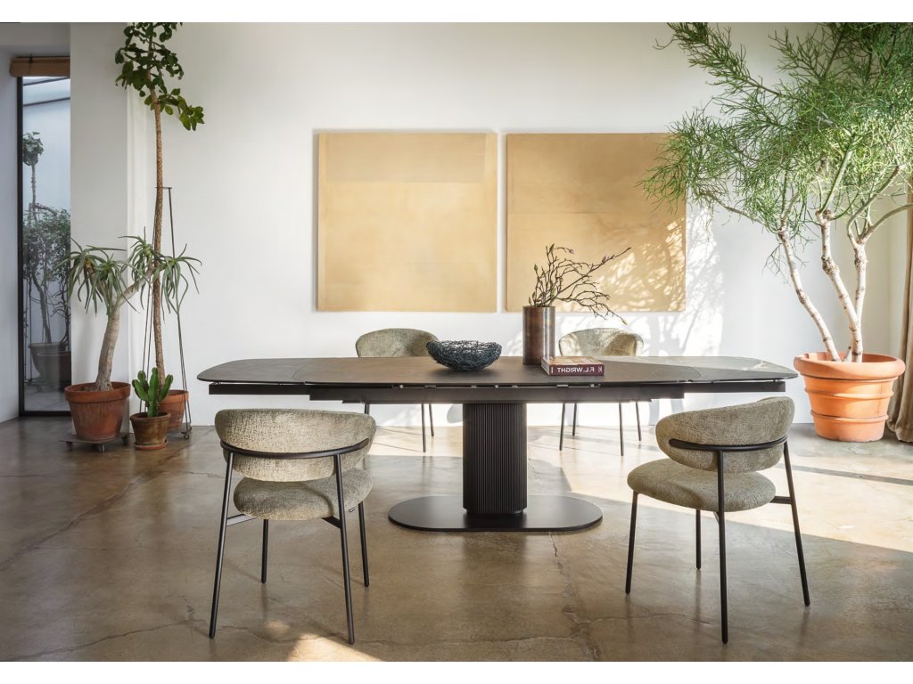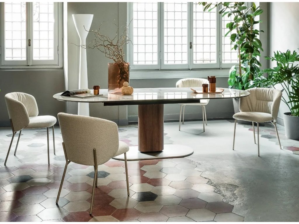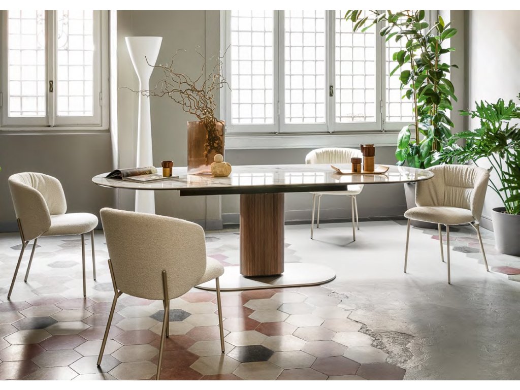 pokud chcete do jídelny přidat útulné oblé tvary, je stůl Cameo s elegantní oválnou deskou dokonalou volbou.