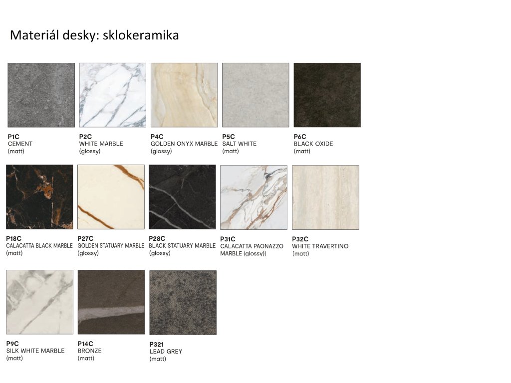 Lead Grey (matná olovnatě šedá), Cement (matná cementově šedá), Salt White (barva přírodní soli matná), Black Oxide (černý oxid matná), Bronze (bronzová matná), White Marble (bílý mramor lesklá), Black Marble (černý mramor lesklý), Golden Onyx Marble (onyx lesklý), Silk White Marble (bílý mramor matný)