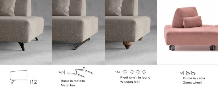 Volitelné nohy (za příplatek): | kolečka s brzdou výška 12 cm, dřevěné nohy dubové (Rovere Cenere) výška 14,5 cm, kovová podnož v Bronz Vintage laku výška 14,5 cm |